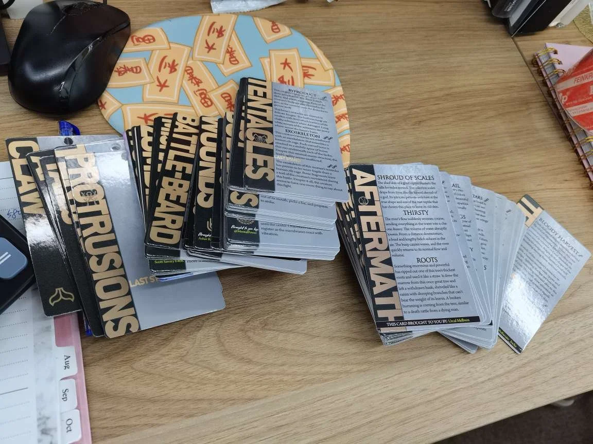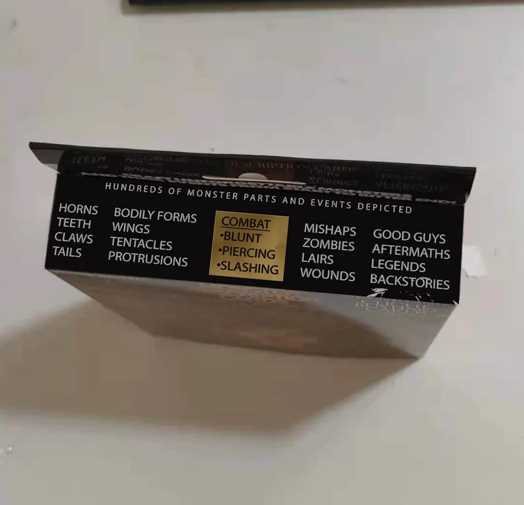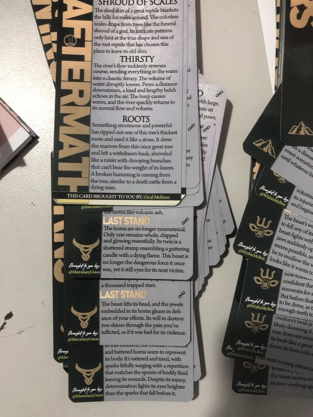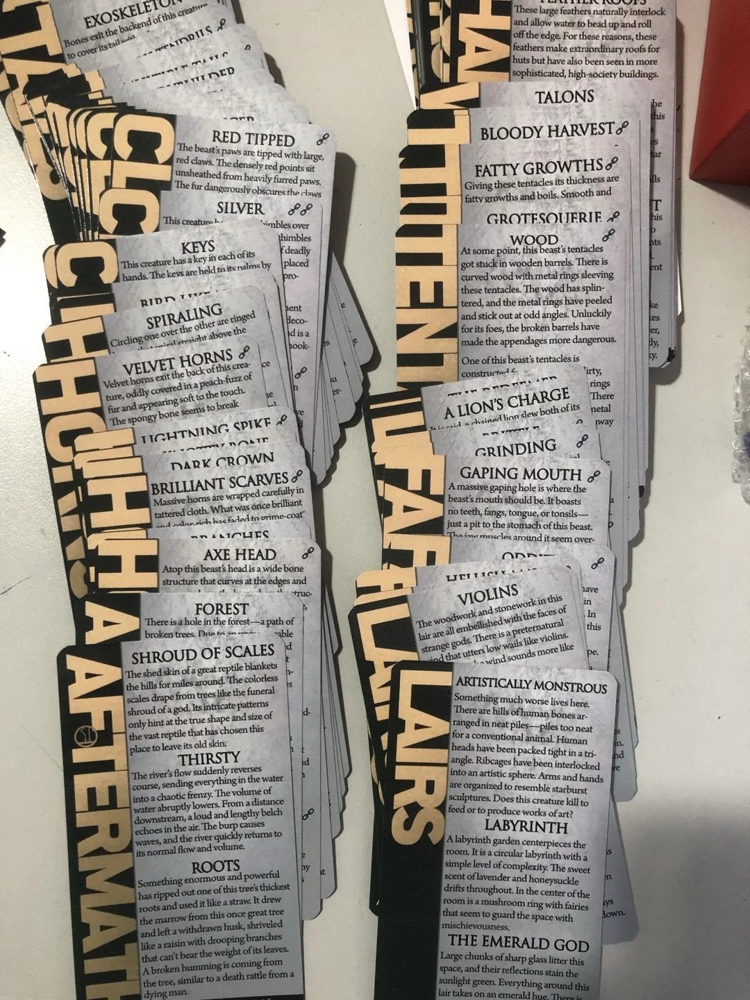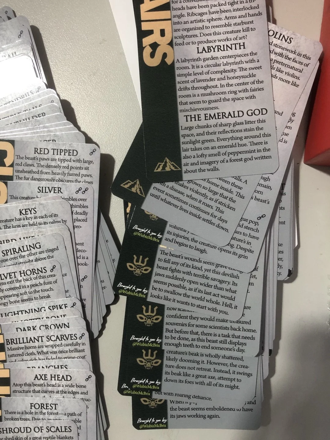 The Monster Description Cards are extensive storytelling tools containing purposely unique flavor text to add realism or memorable characterization to creatures and their subsequent events. The cards provide keywords to spark your imagination and example phrases of their use. Written by novelists and organized by dungeon-masters, the cards are designed for quick on-the-fly use and inherently adds randomization.